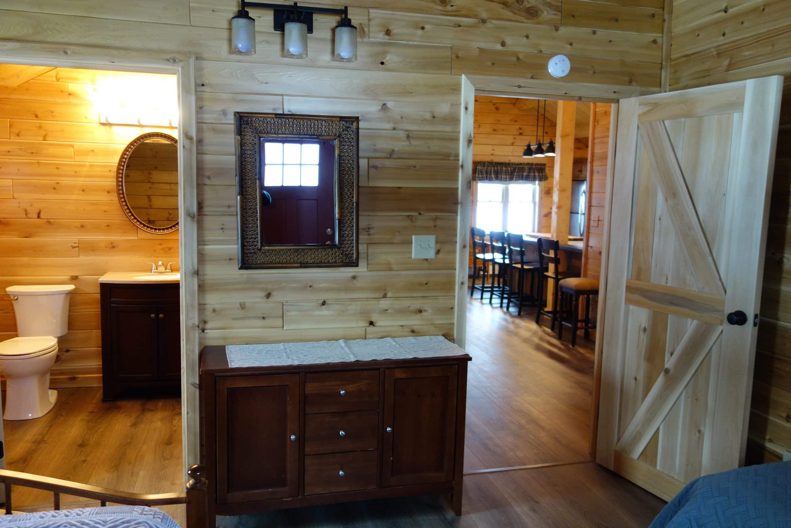 Cabin 3 is a 1000sq/ft 2 bedroom 2 full bath brand new log cabin. Each bedroom has a queen bed and a twin bed. It also has a fully equipped kitchen, satellite TV, WIFI, covered front porch, gas BBQ grill, fire-pit and picnic table.